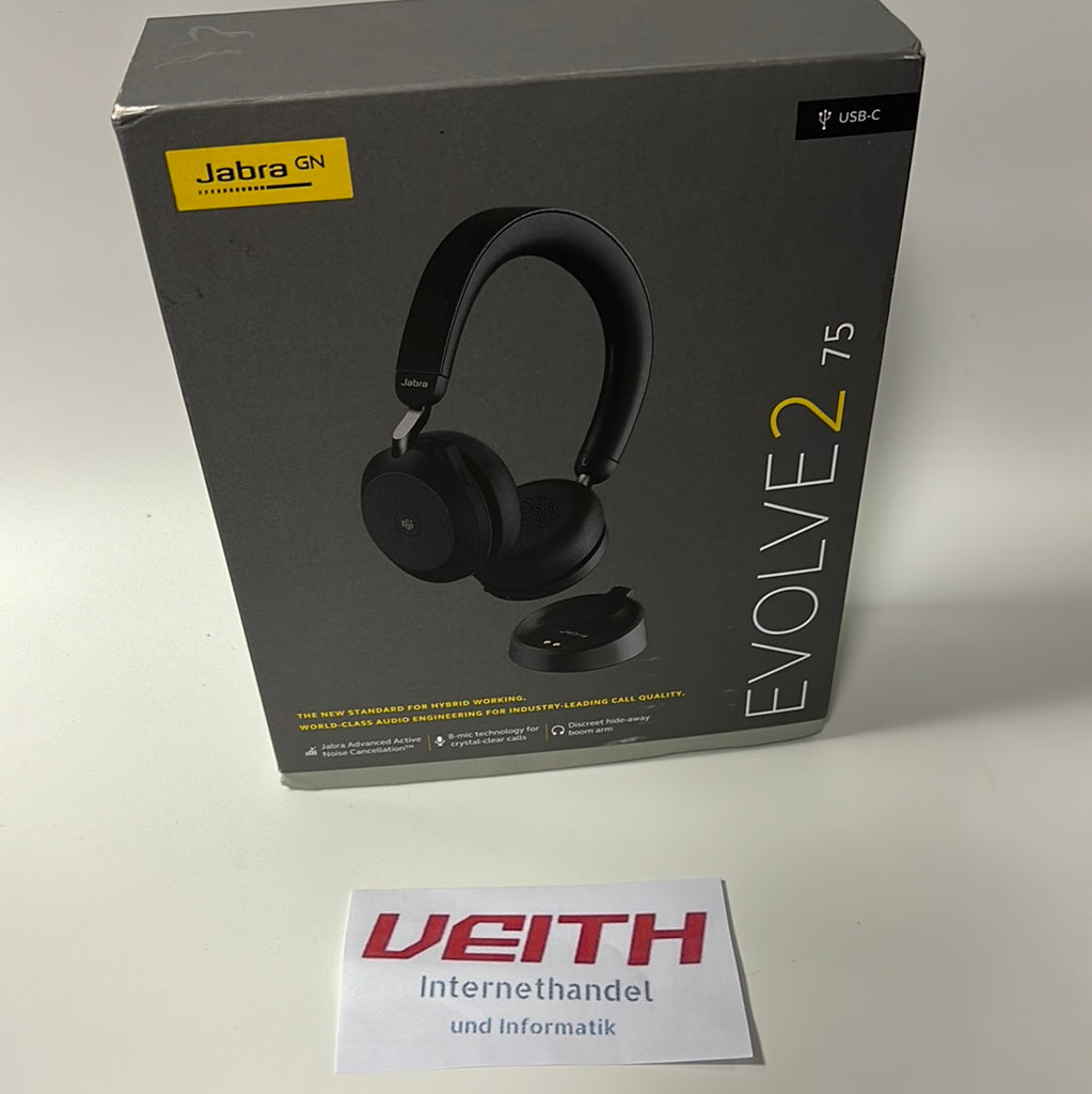 - Lieferumfang: 1x Jabra Evolve2 75 Headset mit Ladeständer, USB-C Link 380 Bluetooth-Adapter und USB-C-Kabel, Tragetasche, Gewicht: 197g / 6.9oz, Schwarz. Alles in nachhaltiger, recycelbarer Verpackung