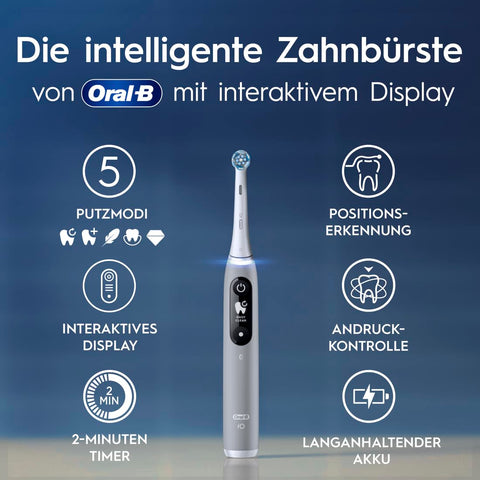 - DIE SMARTE ZAHNBÜRSTE VON ORAL-B mit interaktivem Display zur Auswahl der Putzprogramme, Tracking der Putzzeit, Erinnerung an den Bürstenkopfwechsel und Anzeige zum Akkustand