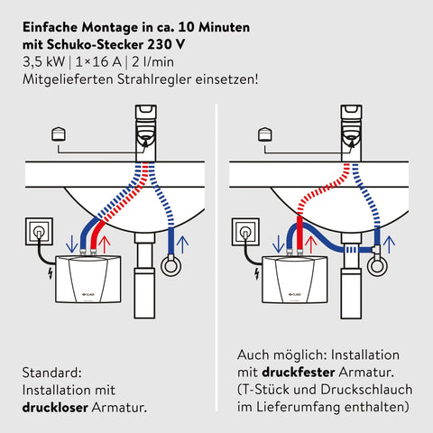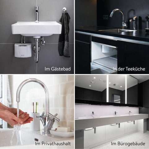 - 𝗘𝗜𝗡𝗦𝗔𝗧𝗭𝗕𝗘𝗥𝗘𝗜𝗖𝗛 – Elektronisch geregelter Durchlauferhitzer für die Warmwasserversorgung an einem einzelnen Waschbecken (z.B. im Gäste-WC, in der Teeküche oder in gewerblichen Sanitärräumen). Das Gerät ist kompatibel mit allen druckfesten und drucklosen Armaturen. Der kleine Durchlauferhitzer ist nicht geeignet für den erhöhtem Warmwasserbedarf (z.B. in Küche und Bad). Dafür empfehlen wir die CLAGE Durchlauferhitzer mit Starkstrom-Anschluss.