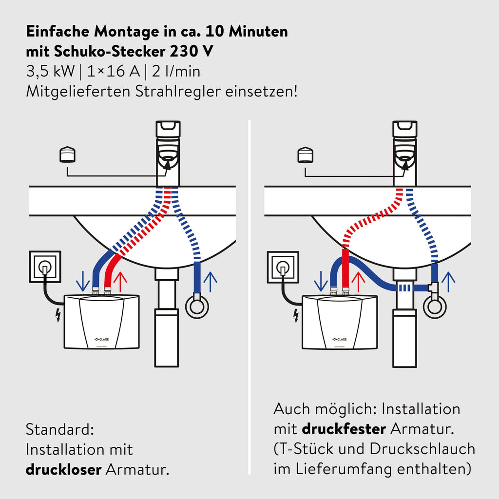 - 𝗟𝗜𝗘𝗙𝗘𝗥𝗨𝗠𝗙𝗔𝗡𝗚 – CLAGE Durchlauferhitzer (Made in Germany), 50cm langer flexibler Anschluss-Schlauch ⅜-Zoll, T-Stück, mehrsprachige Gebrauchs- und Montageanleitung, Spezial-Strahlregler, Befestigungsmaterial, Netzkabel, MCX 3 mit Schuko-Stecker.
