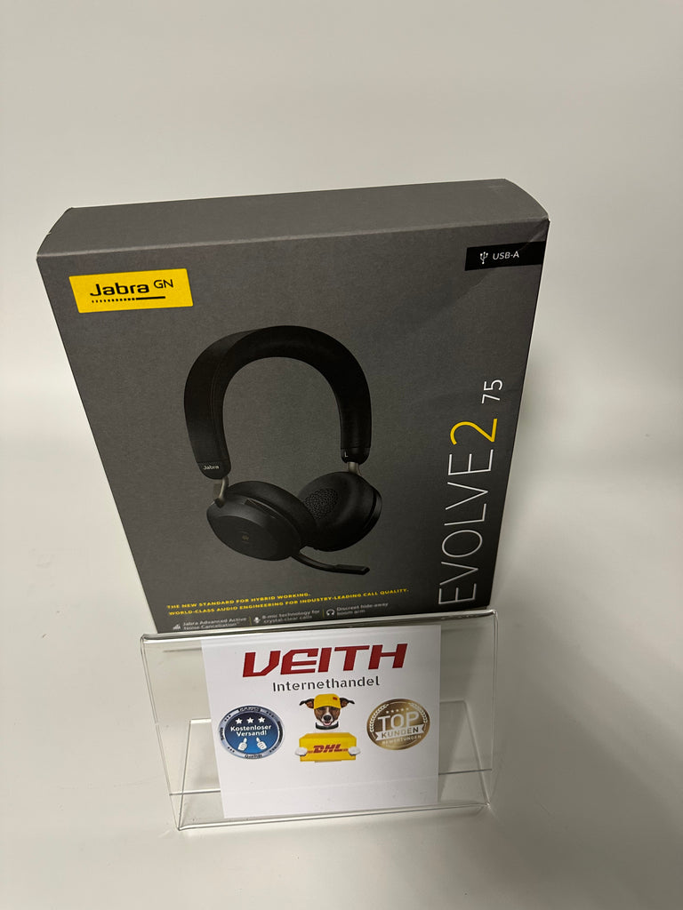 - Lieferumfang: 1x Jabra Evolve2 75 Kopfhörer, USB-A Link 380 Bluetooth-Adapter und USB-A-Kabel, Tragetasche, Gewicht: 197 g / 6.9 oz, Farbe: Schwarz. Alles in nachhaltiger, recycelbarer Verpackung