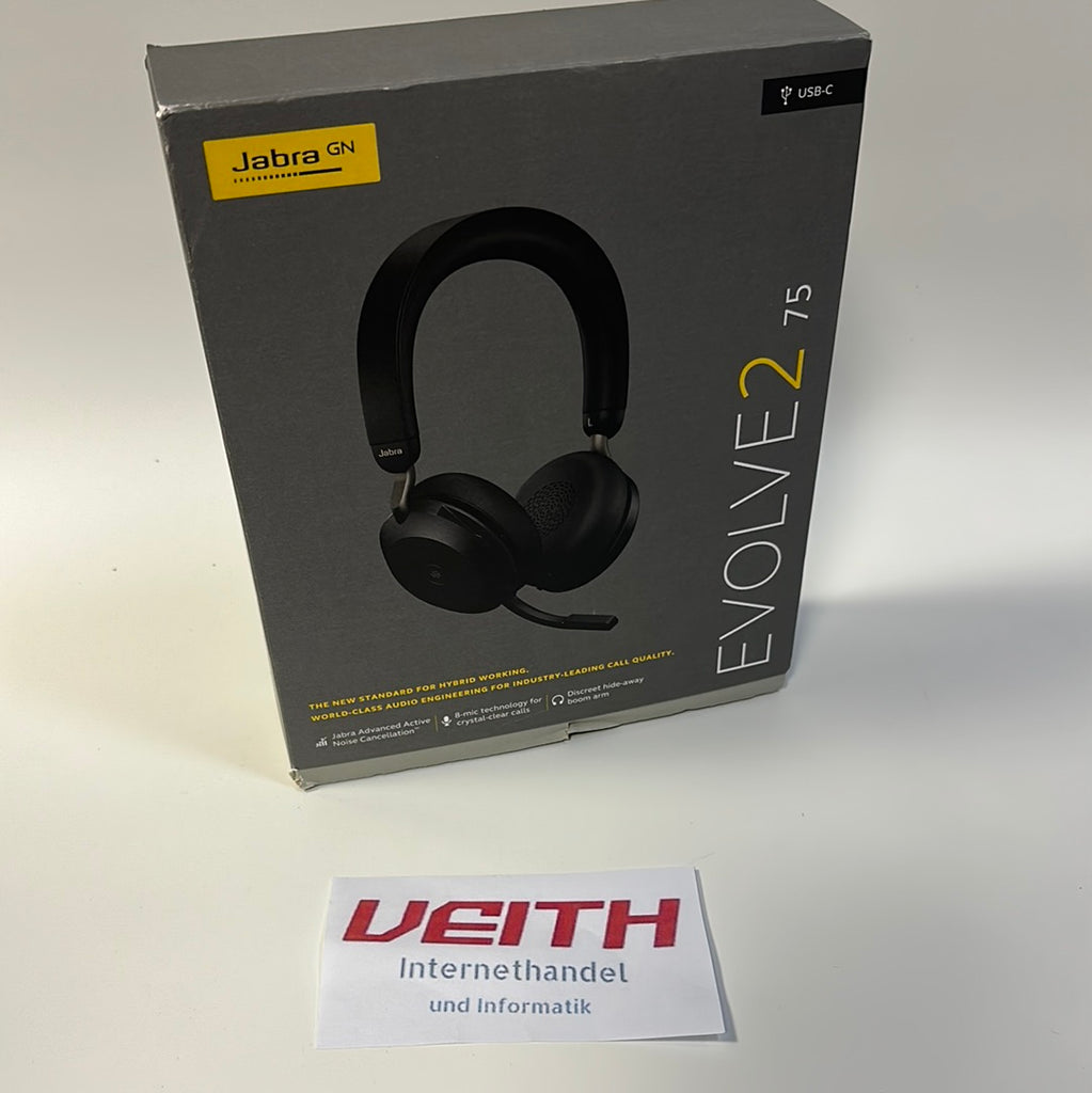 - Lieferumfang: 1x Jabra Evolve2 75 Kopfhörer, USB-C Link 380 Bluetooth-Adapter und USB-C-Kabel, Tragetasche, Gewicht: 197 g / 6.9 oz, Farbe: Schwarz. Alles in nachhaltiger, recycelbarer Verpackung