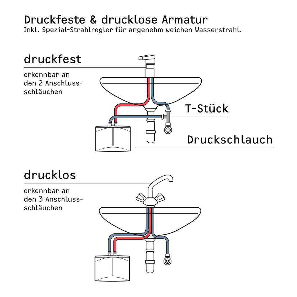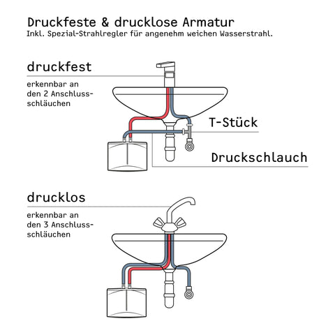 - ARMATUR: Für druckfeste (erkennbar an den 2 Anschlussschläuchen) & drucklose Armatur (erkennbar an den 3 Anschlussschläuchen)