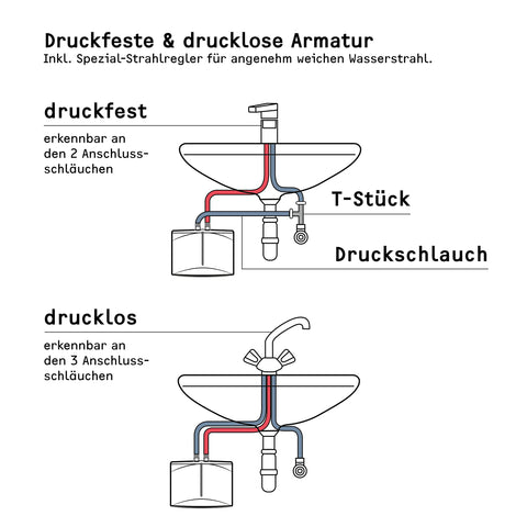 - ARMATUR: Für druckfeste (erkennbar an den 2 Anschlussschläuchen) & drucklose Armatur (erkennbar an den 3 Anschlussschläuchen)