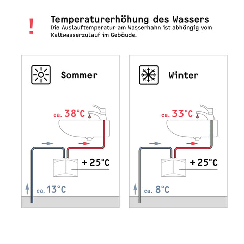 - TEMPERATURERHÖHUNG DES WASSERS um 25 Grad: Die Auslauftemperatur am Wasserhahn ist abhängig vom Kaltwasserzulauf im Gebäude; Warmwasserdurchflussmenge: max; 2,0 l/min