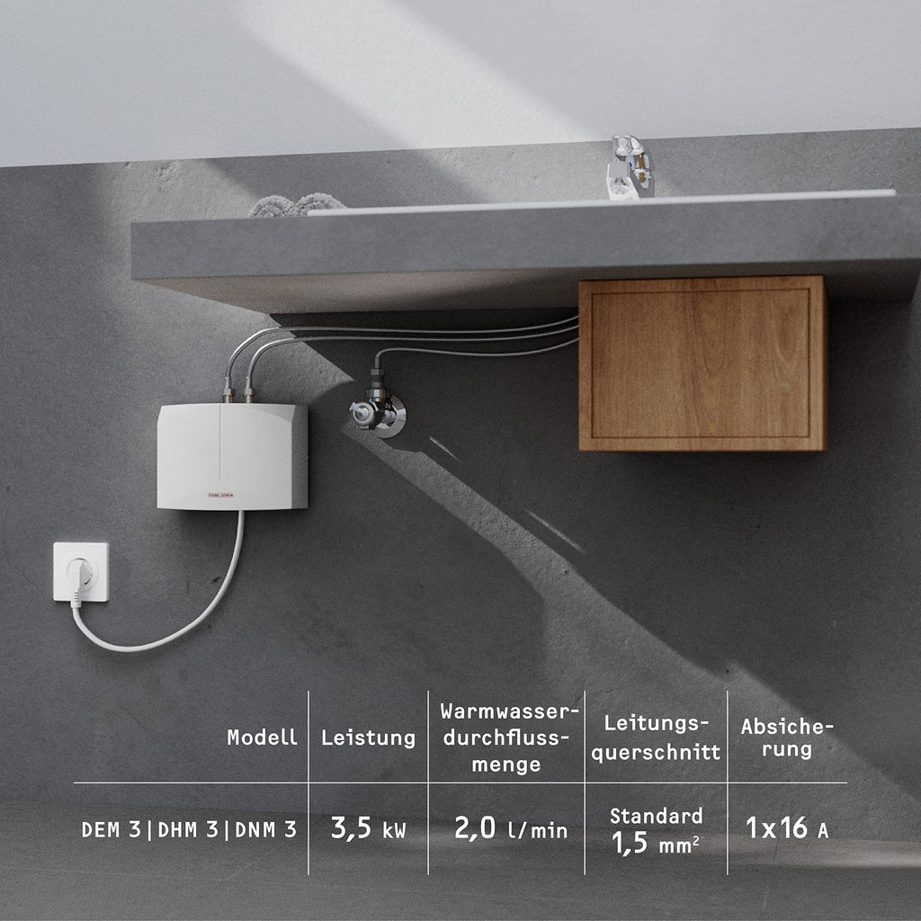 - EINSATZBEREICH: Mini-Durchlauferhitzer mit Stecker für Handwaschbecken im Gäste-WC; Sofort lauwarmes Wasser (ca; 35°C); Nicht geeignet für Küche und Bad - hier ist ein STIEBEL ELTRON Kleinspeicher oder Durchlauferhitzer ab 11 kW notwendig